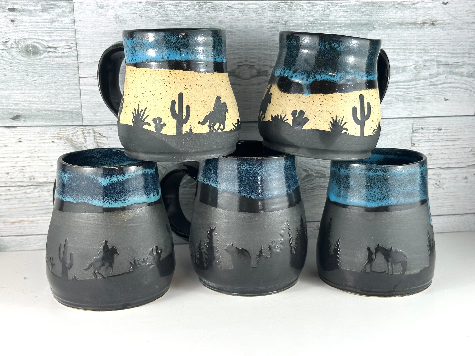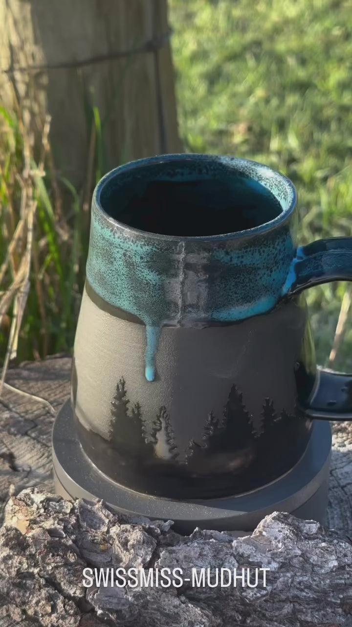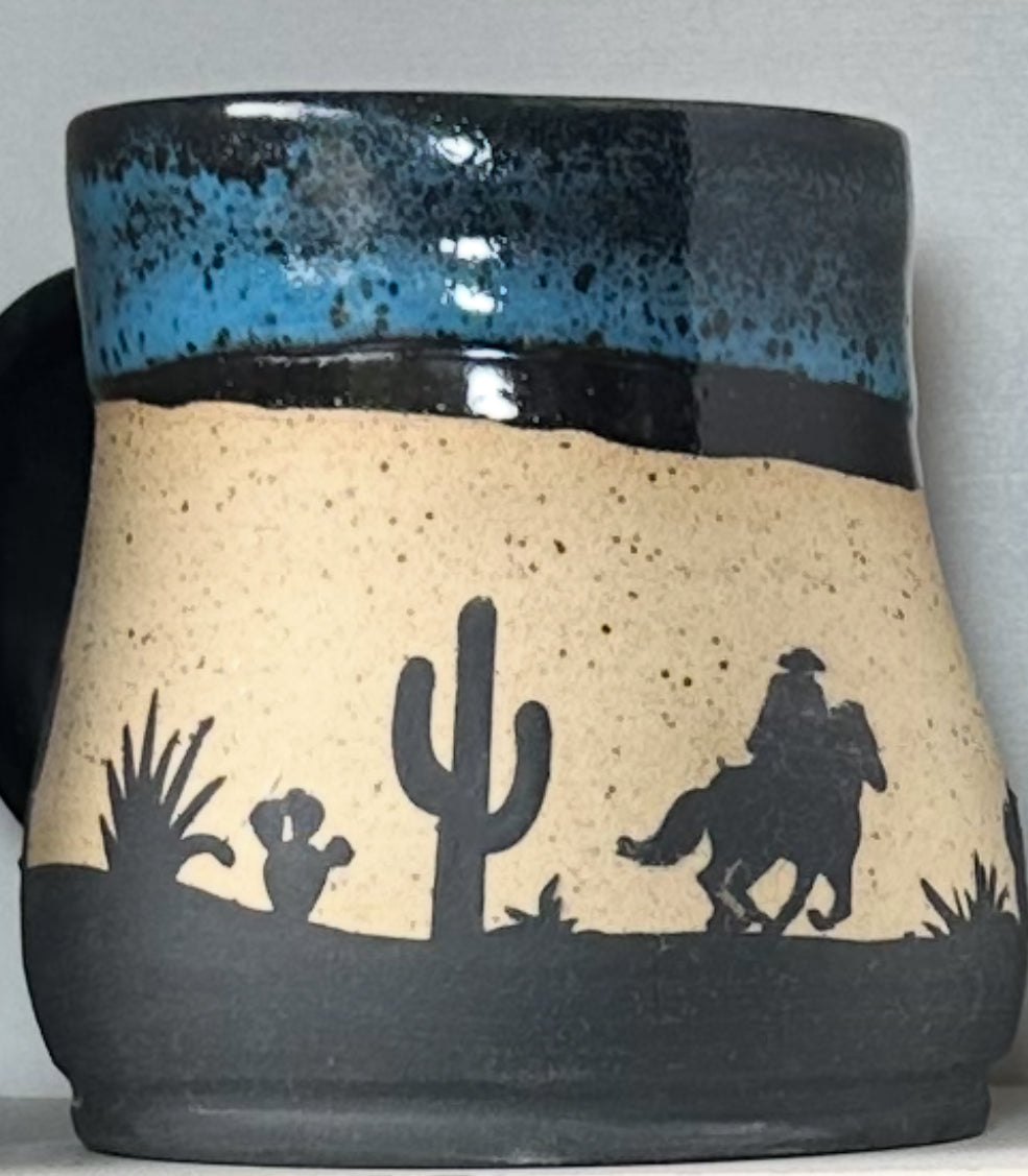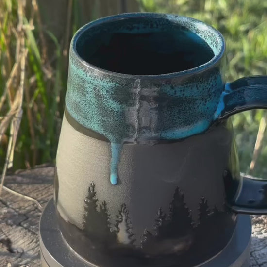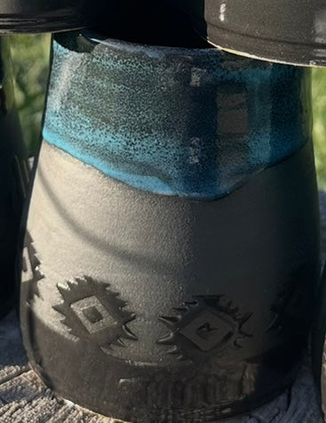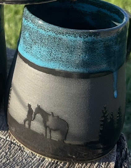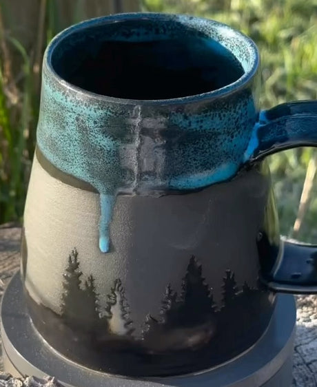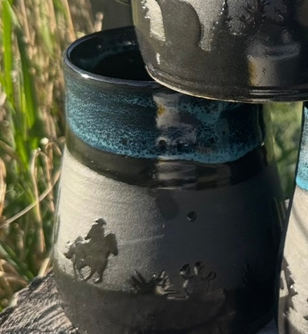 Saddle up your morning routine with this wheel-thrown beauty straight outta the kiln and into the wild. Featuring bold silhouette designs of trees, bears, cowboys, and desert scenes, each mug tells a story of the great outdoors and starry nights on the range. Glazed in a striking black and turquoise combo, it’s equal parts rustic charm and celestial chic. It's perfect for adventurers and caffeine cowboys alike.