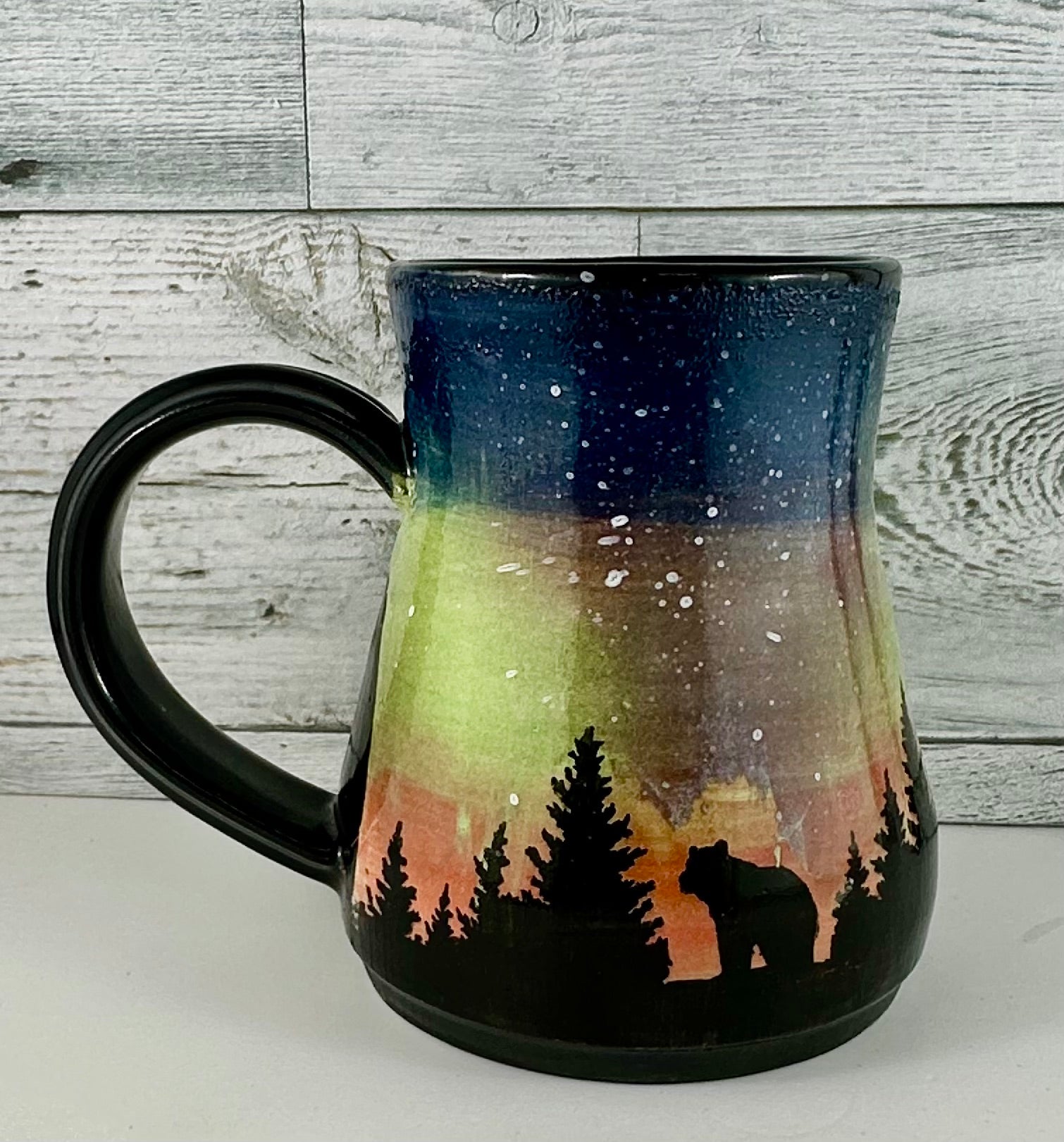 Discover the magic of the Northern skies with our "Aurora Bear Mug"! Handcrafted with love on the potter’s wheel, each mug is a unique masterpiece, capturing the enchanting dance of the Northern Lights. Picture this: a cozy evening, your favorite brew, and a stunning panorama of swirling auroras, beautifully painted behind the silhouettes of a majestic bear and whispering trees. Whether you're an adventurer at heart or a dreamer of distant horizons, this mug transforms every sip into a journey under the mystical sky. Grab yours and let the adventure begin!